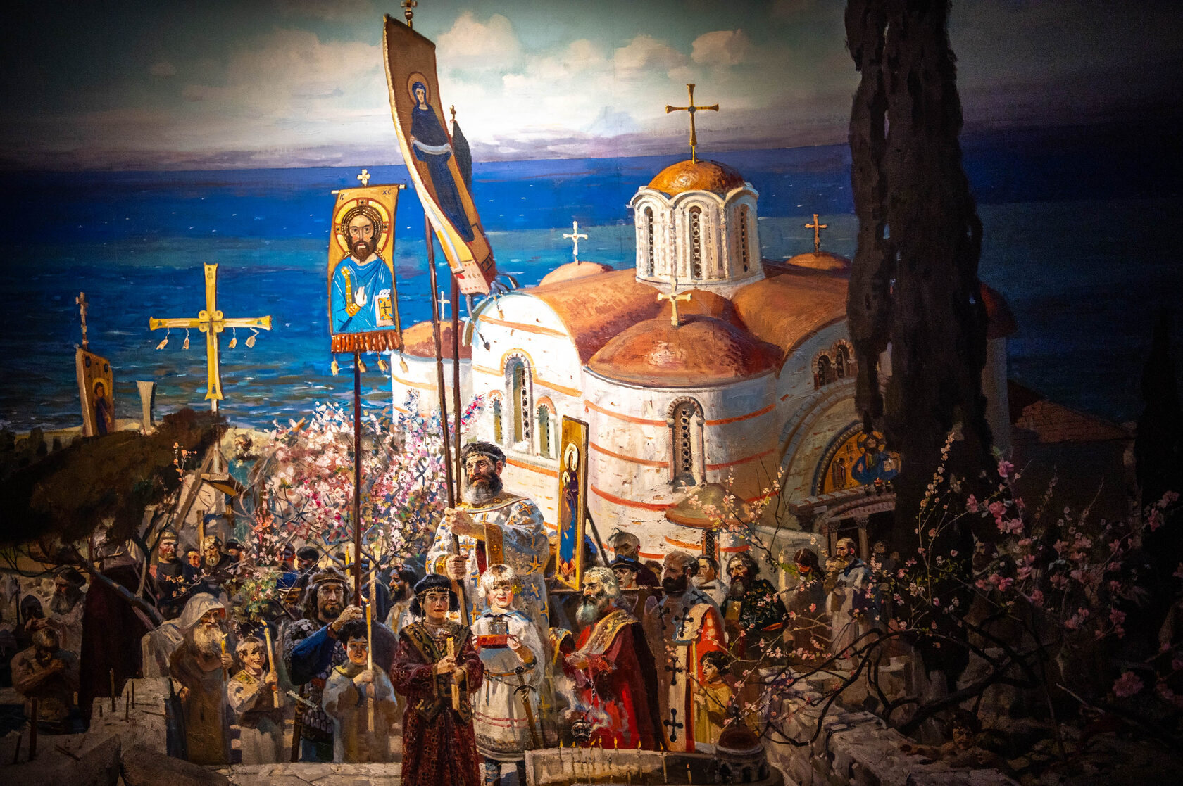 Кульминацией экскурсионного маршрута становится диорама Павла Рыженко «Крещение Руси» длиной 35 метров и высотой 5 метров. Благодаря сочетанию предметного плана, архитектуры, аромадизайна и проекционного мэппинга, создается эффект «ожившей картины»: легкая рябь воды, мерцание свечей, движение плащей — ключевой эпизод истории разворачивается буквально перед глазами зрителя. Для реализации такой задачи командой «ВИЖУ» была оцифрована вся диорама и создан цифровой двойник полотна. Данная работа была проведена в Студии военных художников имени М. Б. Грекова, где полотно реставрировали и готовили к последующей установке в музей Античности и Византии.
