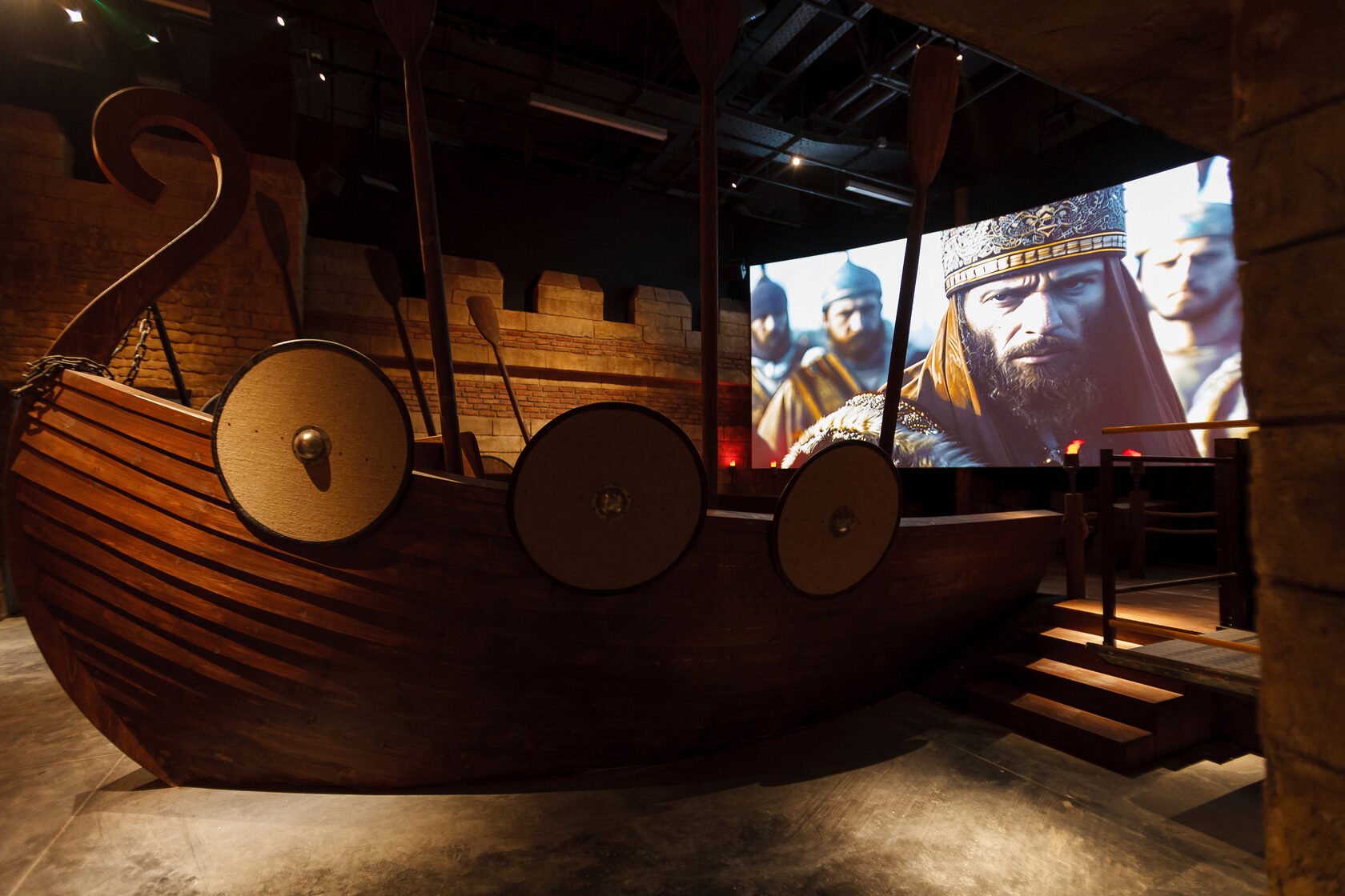 Второй зал посвящен отношению Византии и Древней Руси. Здесь зритель оказывается на «палубе древнерусской ладьи», где сквозь судьбы Кирилла и Мефодия, вещего Олега и княгини Ольги разворачивается сага становления Руси — от первых походов на Константинополь до Крещения Владимира. Управляемый свет, факелы и звук работают тонко и деликатно, усиливая вовлечение, но не перегружая восприятие.