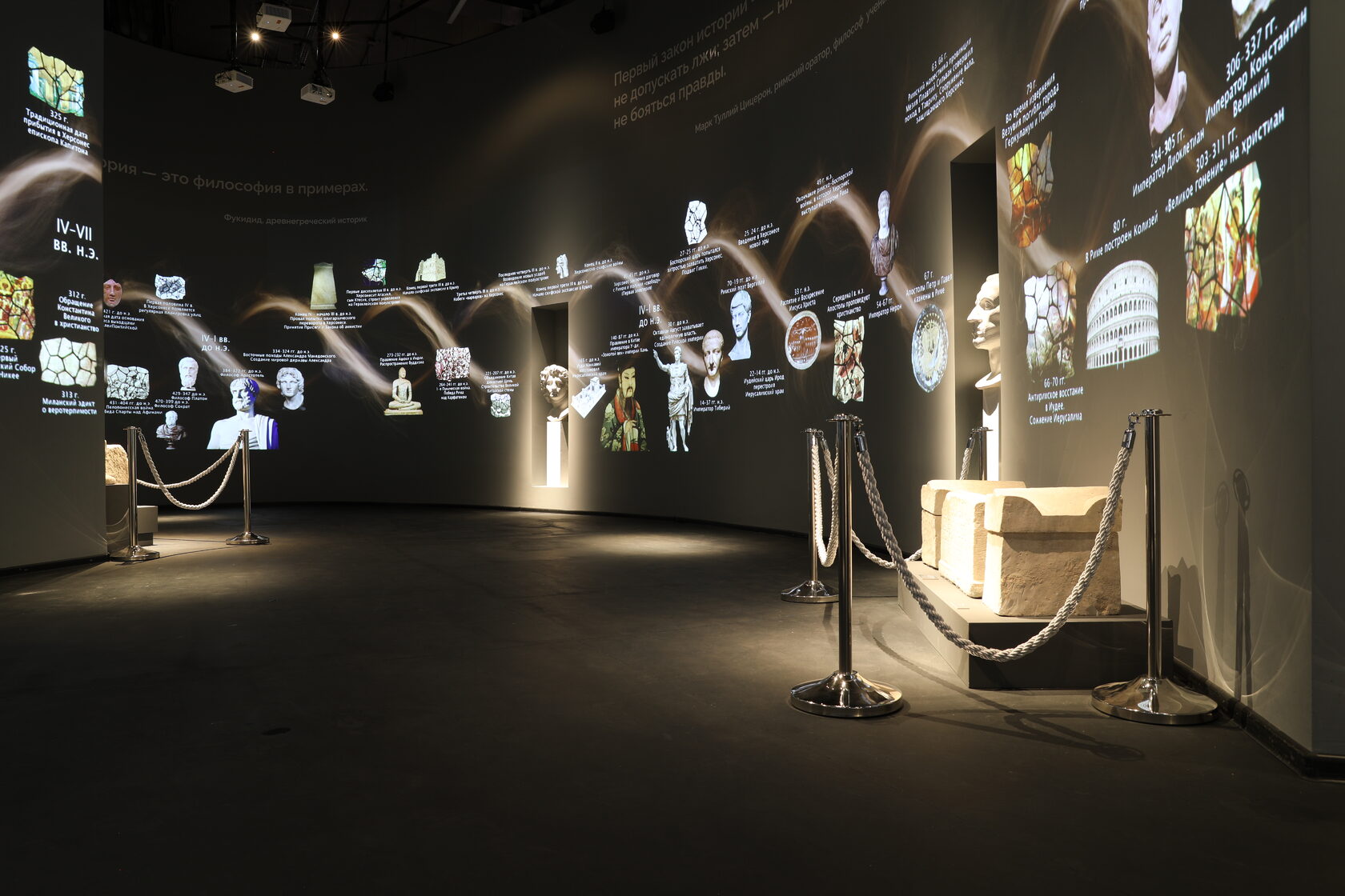 Экспозиция в Музее Античности и Византии развернулась на площади около 1000 м². Каждый элемент выставки буквально «разговаривает» с посетителем. Маршрут начинается с мультимедийного пролога «Пески времени»: архитектурные элементы, статуи и герои античности, такие как Архимед, Платон и Гиппократ, «оживают» на проекционных поверхностях. Зал вовлекает посетителя в диалог с историей, а три кинематографических рассказа показывают, как Греция, Рим и Византия сформировали культурный код Херсонеса. В рамках технической реализации была решена амбициозная задача: несмотря на сложную геометрию, изображения десяти проекторов бесшовно сведены в две панорамы общей длиной 25 метров.